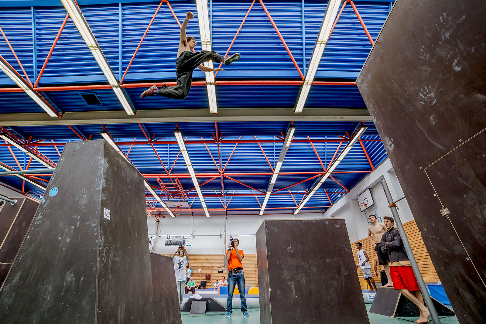 LTR: zwei Turnhallen voller Obstacles: Stangengerüst, Boxen ohne Ende, 3 Riesentrampoline, 2 Airtracks,..
